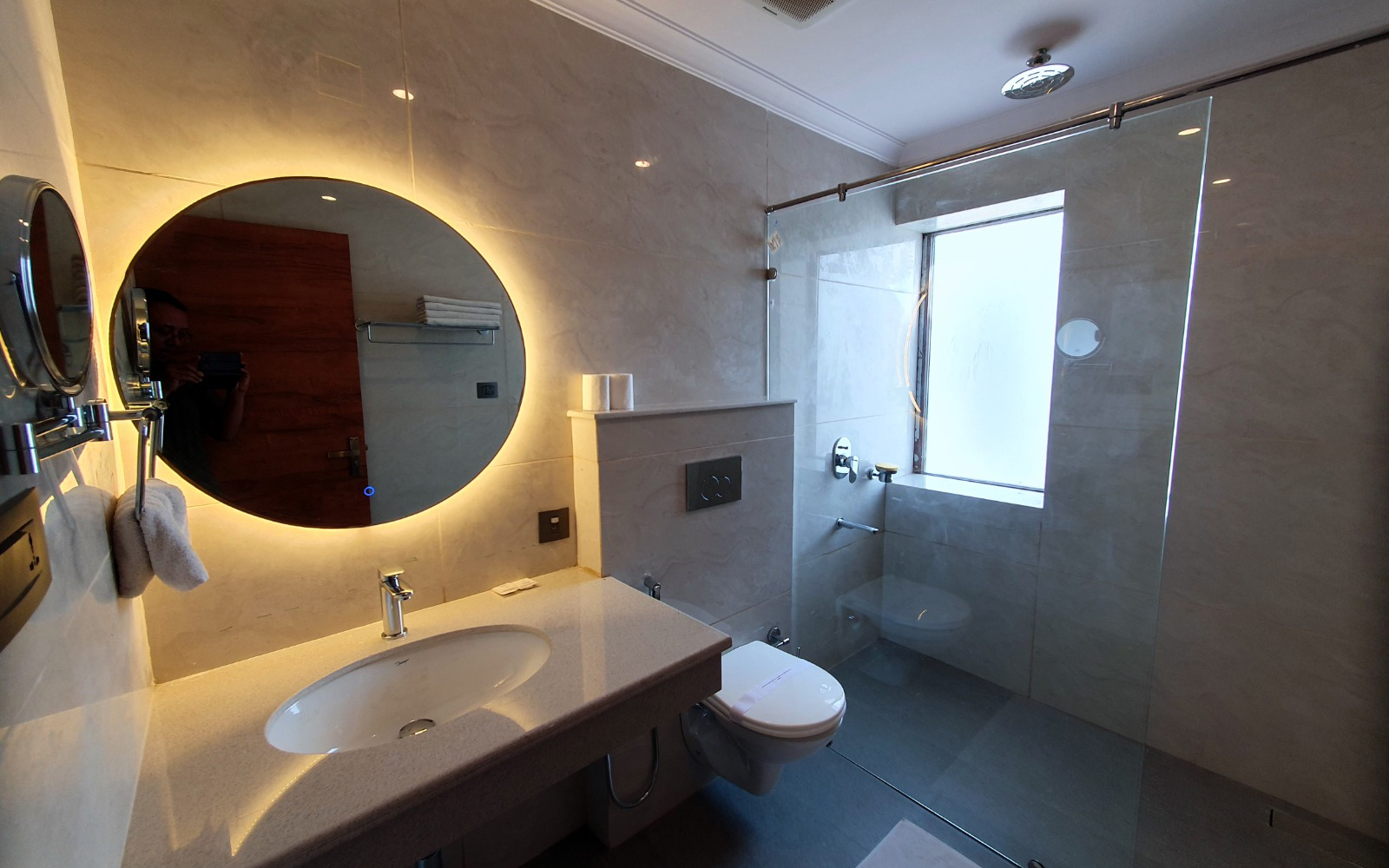 Spacious hotel bathroom with modern amenities, ample counter space, and a luxurious soaking tub.